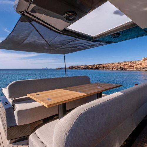 Suba al flybridge para disfrutar de vistas panorámicas y comandar el yate desde el puesto de mando. El flybridge está amueblado con cómodos asientos, un bar y sistemas de navegación de última generación, proporcionando un punto de vista perfecto para navegar por el Mediterráneo con estilo.