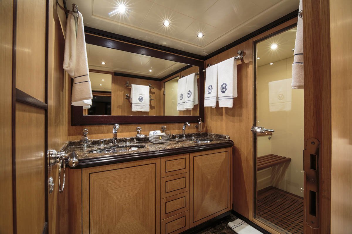 Chill Out can sleep nine guests across its accommodation: a large master cabin with dressing room and sauna, which also has an ample bathroom; a spacious VIP cabin at the bow; a double cabin on the starboard side; and another cabin on the port side with two single beds, and a fold-out bunk bed that can accommodate a third guest. All of the bedrooms have en-suite bathrooms.